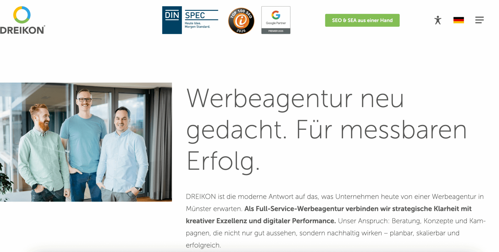 Not many advertising agencies take SEO quality standards seriously enough to help write them. DREIKON from Münster does. Clients include Remmers, Rapunzel Naturkost, and Stadtwerke Münster. They offer dedicated GEO services and have published practical content on KI-SEO, GAIO, and LLMO.
