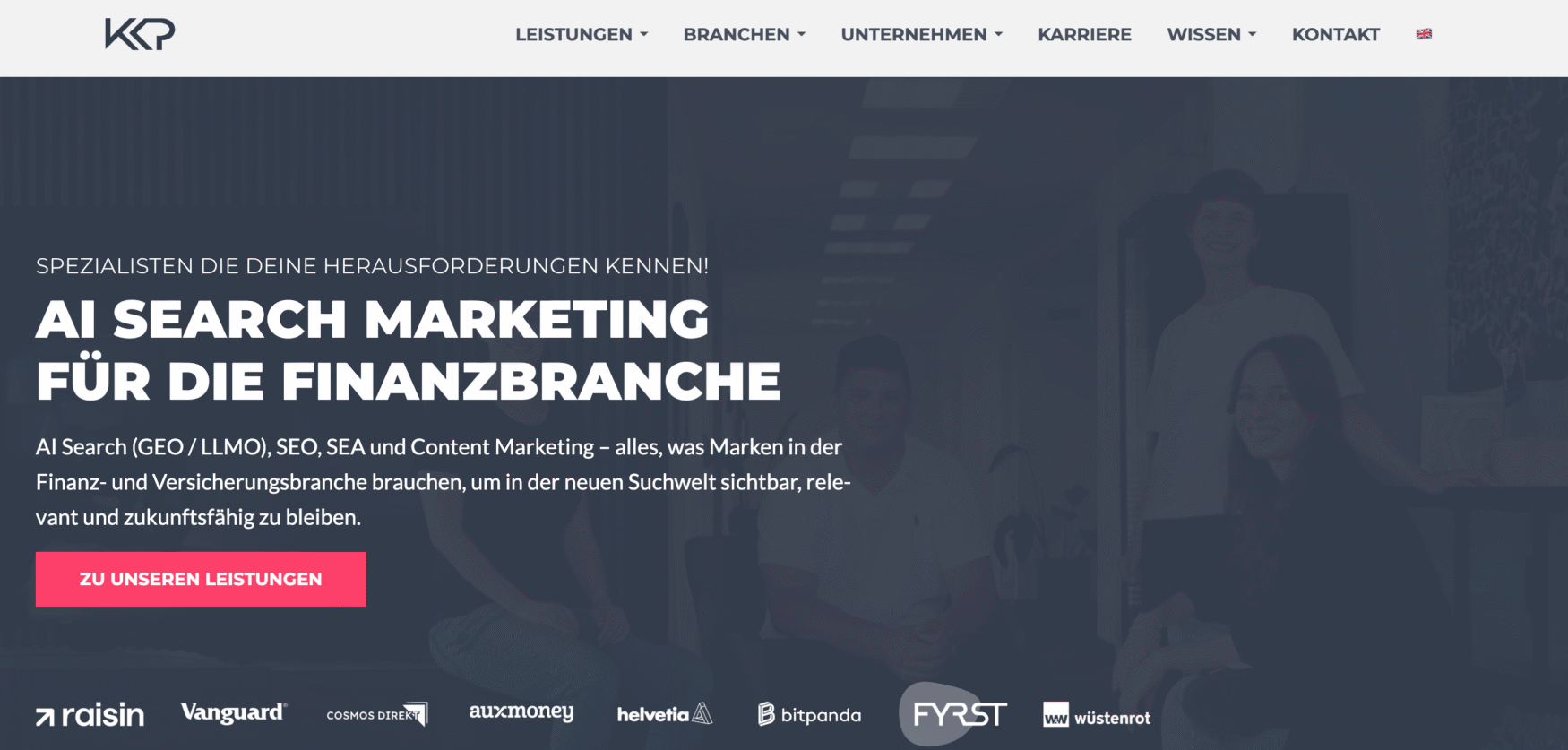 If you operate in finance or insurance, KKP is probably the most specialized option on this list. The Saarbrücken agency focuses exclusively on search marketing and AI Search optimization for this vertical. Their client roster includes Raisin/Weltsparen, CosmosDirekt, Vanguard, auxmoney, and Helvetia. KKP offers dedicated GEO and LLMO services, and their founders regularly speak at OMR, SMX, and SEOkomm. We explored their approach in depth in our podcast episode on how Search in ChatGPT works behind the scenes.