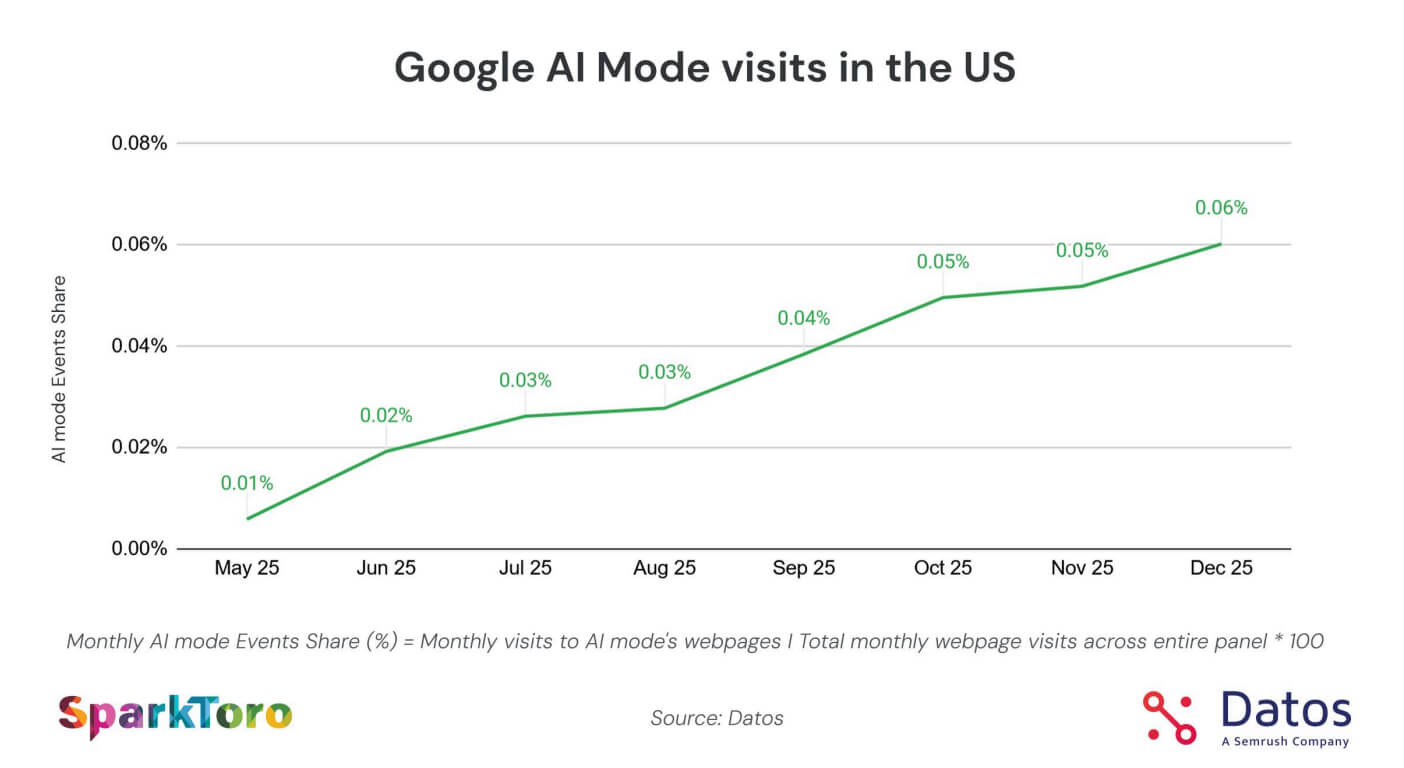 Google AI Mode is still small in absolute numbers but has seen an incredibly steep adoption recently