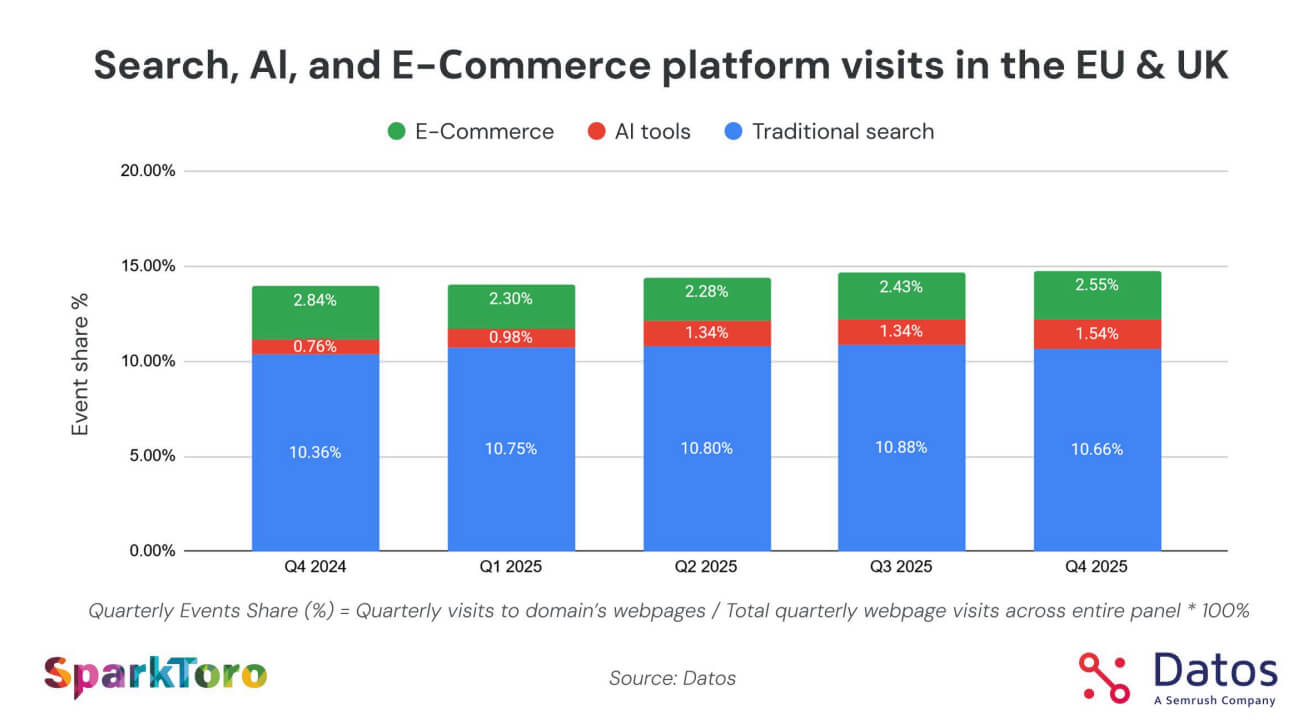 Traditional search is still significantly bigger than AI tools, but they have steadily grown, doubling their share from Q4/2024 to Q4/2025