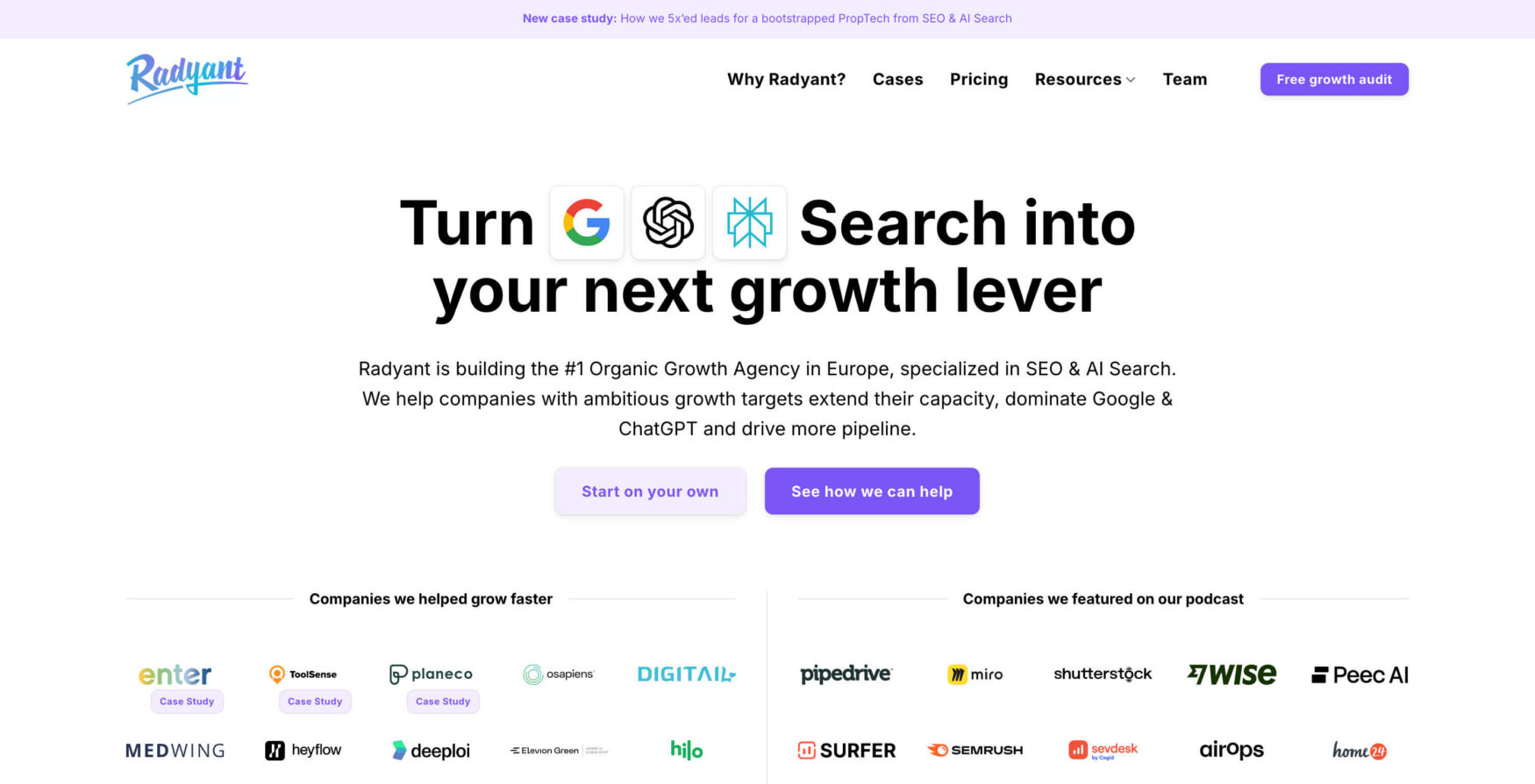 Radyant was founded in 2019 to build the #1 Organic Growth Agency in Europe, specialized in SEO & AI Search. We help B2B startups and scaleups with ambitious growth targets extend their capacity, dominate Google & ChatGPT and drive more pipeline. They started with a focus on the DACH market and have since expanded to other European markets, like Austria, Switzerland, Sweden, the Netherlands, the UK and others.