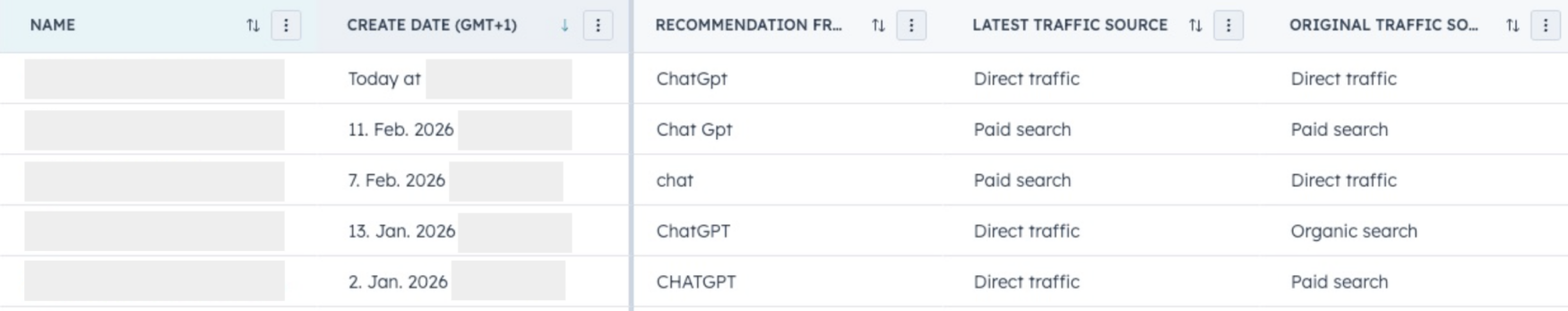 The reason is structural. When someone asks ChatGPT “What’s the best asset management software for mid-size companies?” and gets a recommendation, and then types your brand name into the browser bar, it doesn’t show as ChatGPT. It either auto-completes to your domain (which would be “Direct”) or triggers a Google Search, which leads to a click on your Brand ads (if you’re running some) or your organic ranking of the homepage. So this traffic shows as “Paid Search” or “Organic Search” in your CRM.