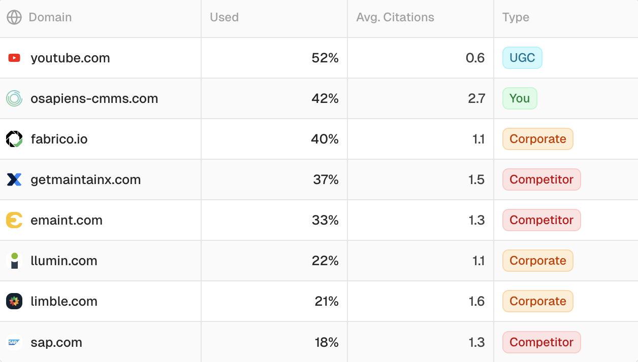 The key insight most teams miss: monitoring competitor citations is more valuable than monitoring your own brand mentions. The most actionable data isn’t “we were mentioned in 40% of prompts.” It’s “G2 review pages, a competitor’s help center article, and a specific YouTube video keep getting cited for prompts we should own.”