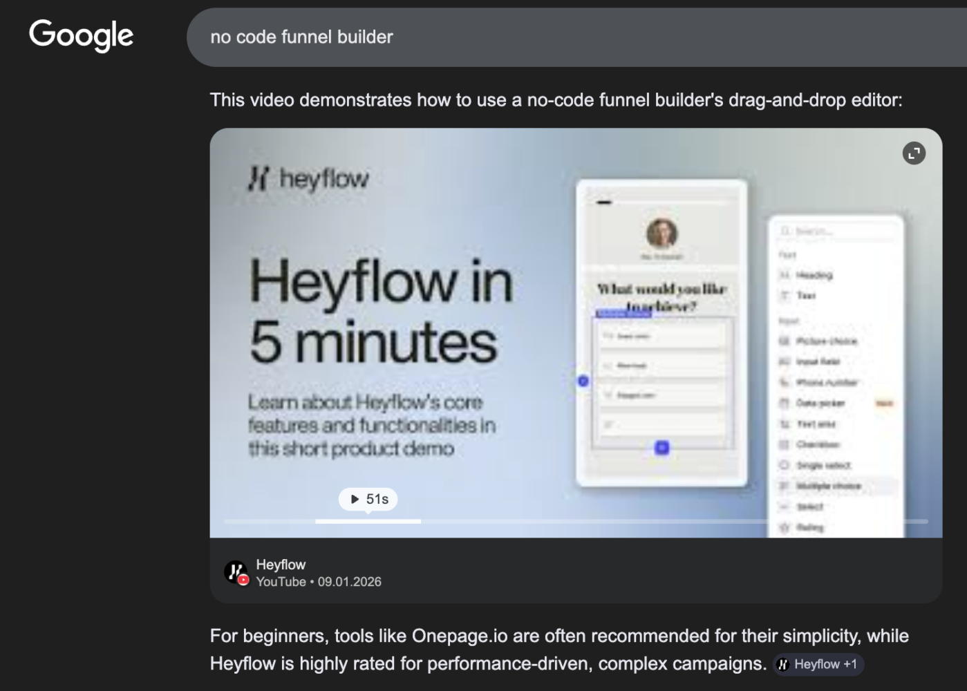 Heyflow YouTube video being prominently embedded in the AI Overview after Radyant’s optimization for highly commercial search “no code funnel builder”