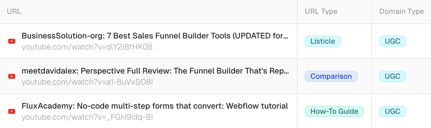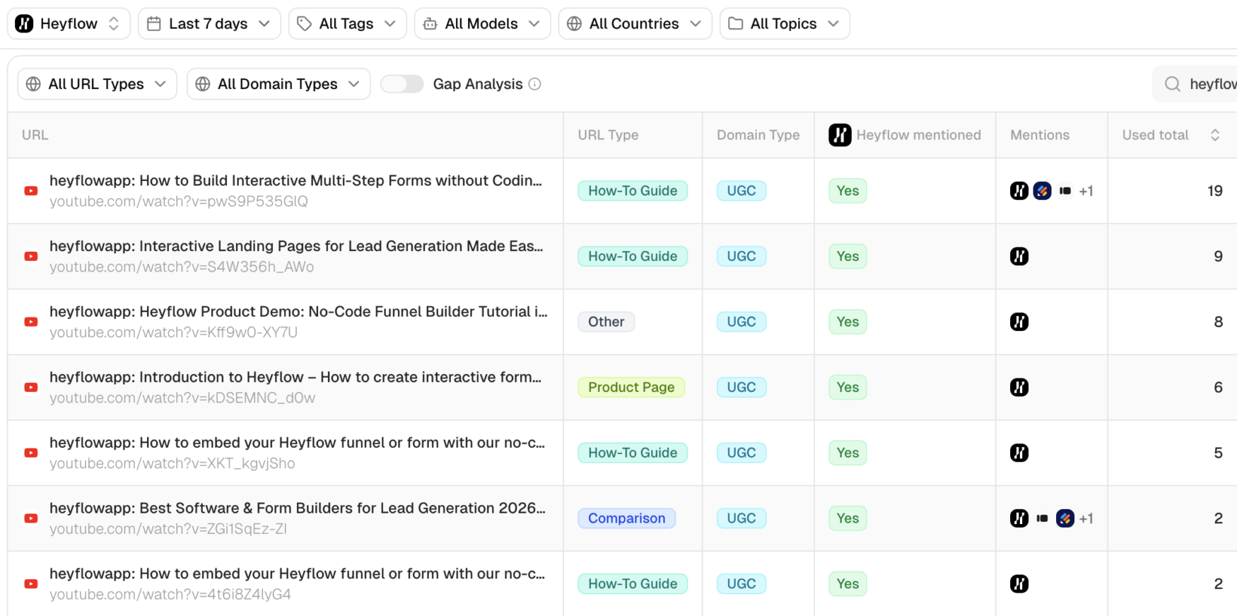 This gives you a prioritized map of where your videos could appear but currently don’t. For Heyflow, this audit revealed that several existing product explainers and tutorial videos were strong topical matches for prompts that were already triggering YouTube citations from competitors.