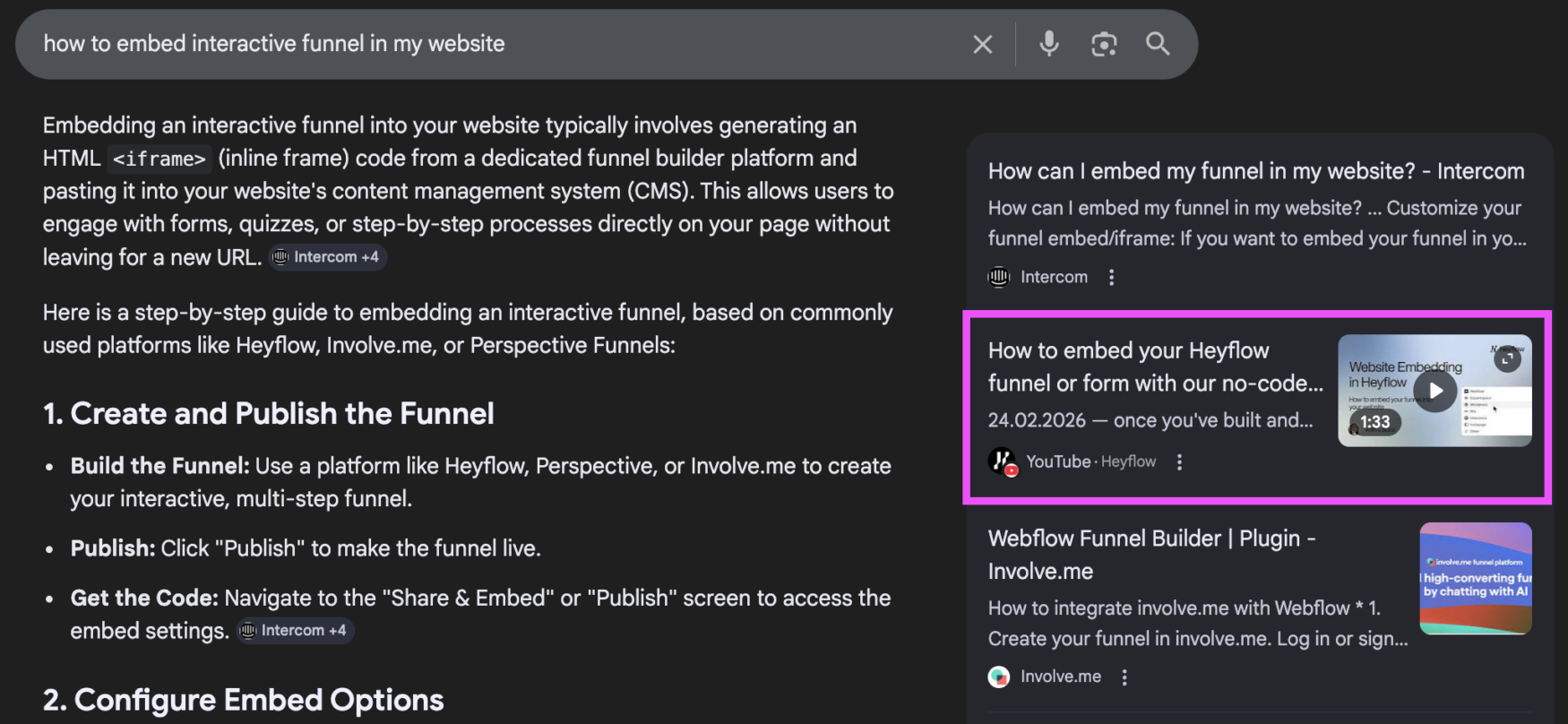 For Heyflow, we’re already seeing optimized videos prominently embedded in AI Overviews for targeted prompts. The early signal is positive enough that we’re moving to Step 5.