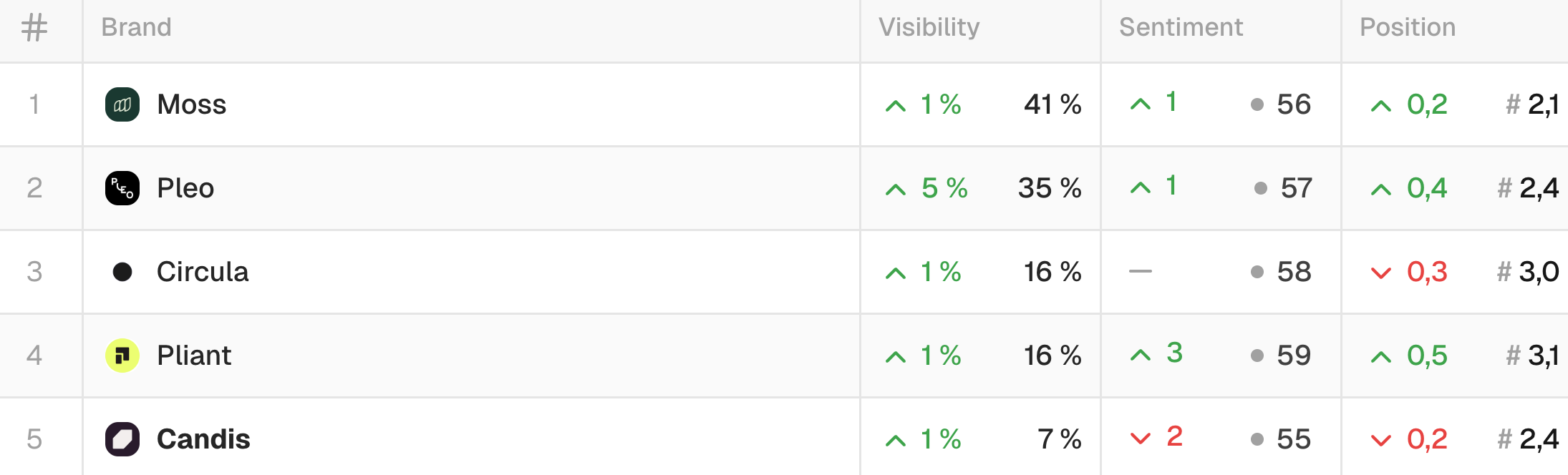 - 5 brands analyzed: Moss, Pleo, Circula, Pliant, Candis