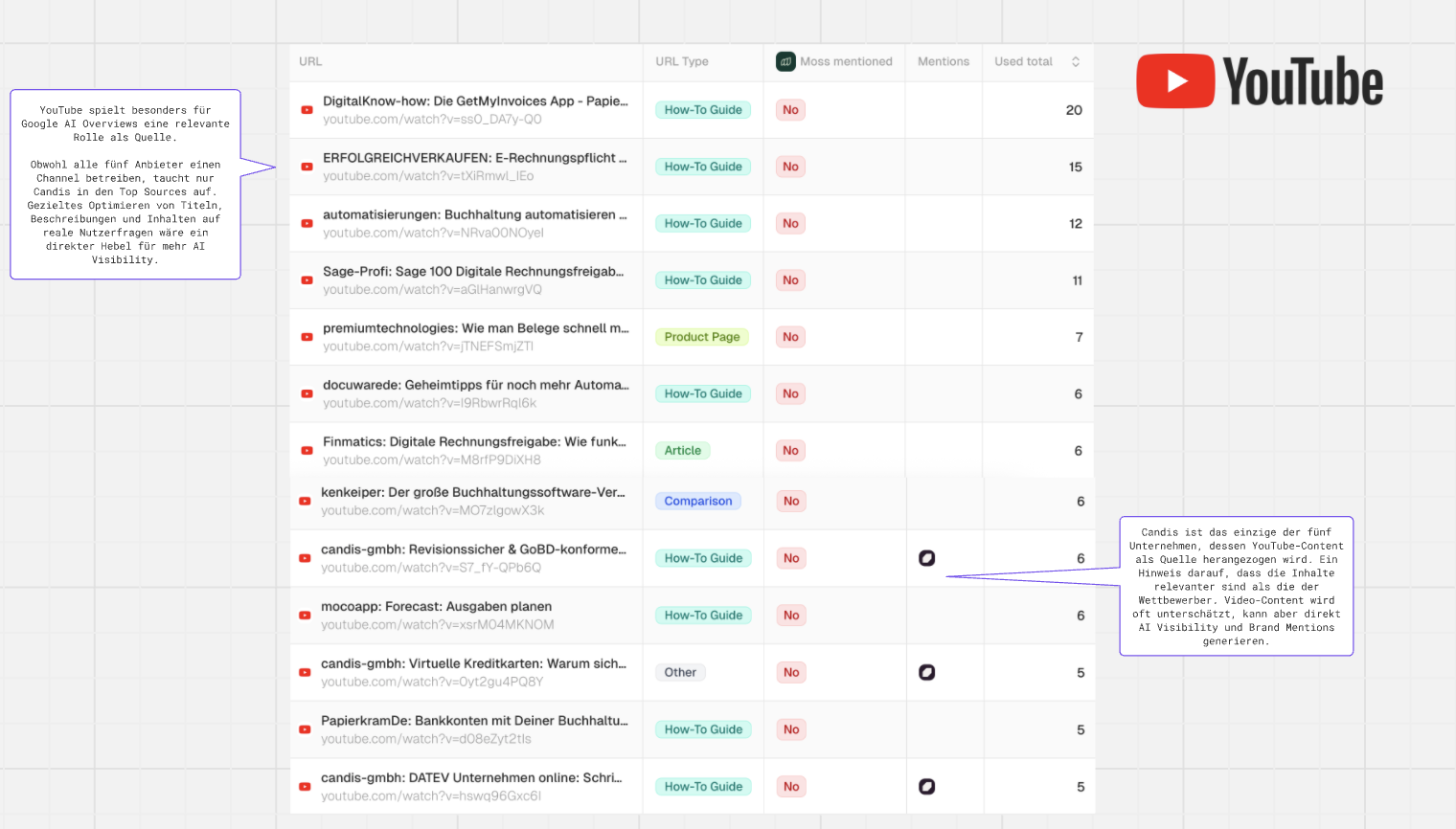 YouTube plays a particularly relevant role for Google AI Overviews as a source. Targeted optimization of video titles, descriptions, and content around real user questions would be a direct lever for more AI visibility.
