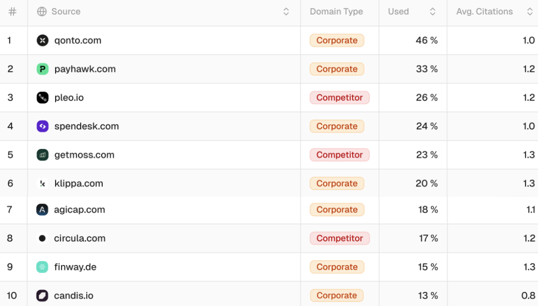 Meanwhile, Pliant doesn’t appear in the top 10 sources across the entire prompt set, despite being a well-known player in the space. At the other end of the spectrum, Pleo leads in the total number of sources referenced, but that alone doesn’t translate to the highest visibility.