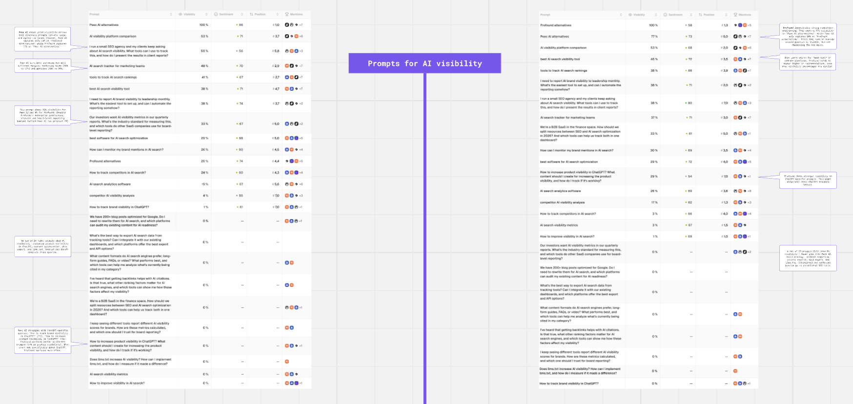Interactive Miro Board with the full Peec AI vs. Profound AI visibility breakdown (by Radyant)