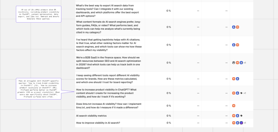 Profound: 8 out of 25 prompts (32%) show 0% visibility – fewer gaps, but still missing on investor reporting, content rewrite, and technical queries.
