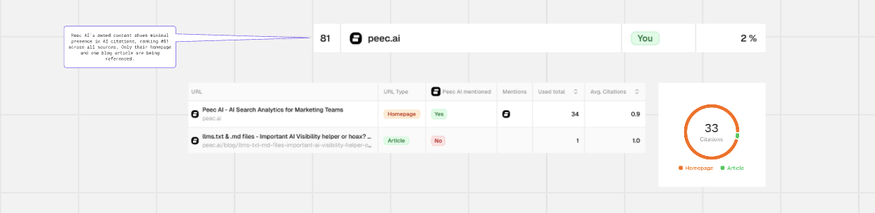 Peec AI ranks #81, with mainly their homepage being referenced. Blog content and guides aren’t breaking through despite existing.
