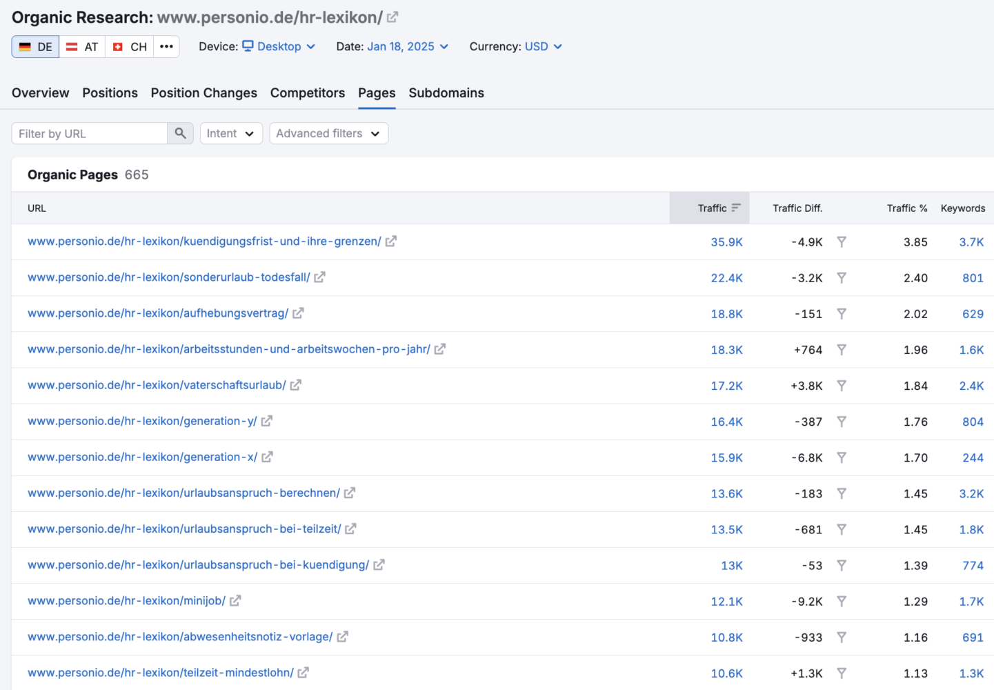 With 30,000+ ranking keywords and over 1.4 million organic visitors monthly, Personio has created an SEO machine that covers the entire HR landscape — from top-funnel informational queries to high-intent commercial searches.