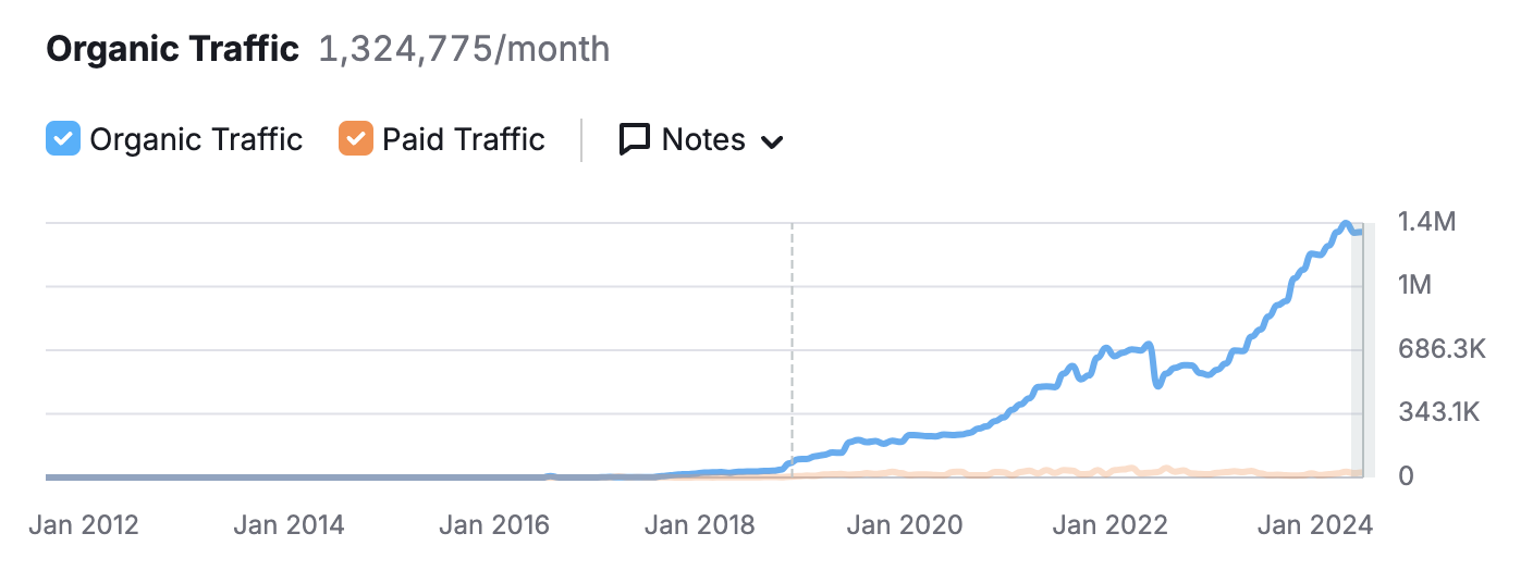 - 30,000+ organic keywords drive over 1.4M monthly visitors.