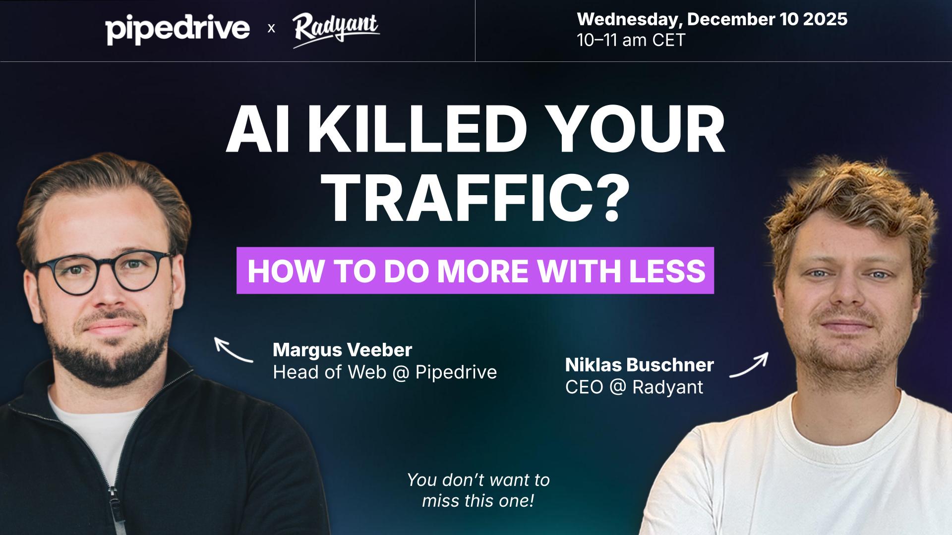 AI killed your traffic? How to do more with less | Pipedrive x RadyantYour traffic is down due to AI? See it as a gift. Most of that traffic was never going to convert anyway. On December 10 at 10 am CET, Margus (Head of Web @ Pipedrive) and I showed how to do more with less. AI search didn’t really kill…